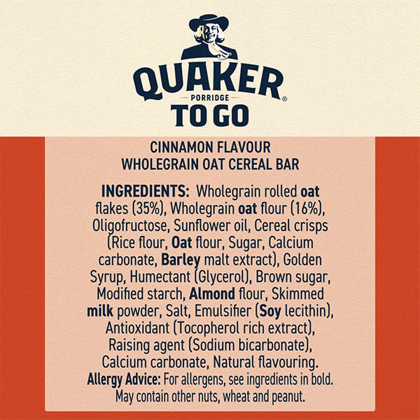 Busy morning? No problem. Quaker To Go Cinnamon Flavour Bars bring you the wholesome goodness of 100% wholegrain oats in a soft, ready-to-eat format. With the warming taste of cinnamon and the same amount of oats as a bowl of Oat So Simple, it’s porridge you can enjoy anywhere – no spoon required.