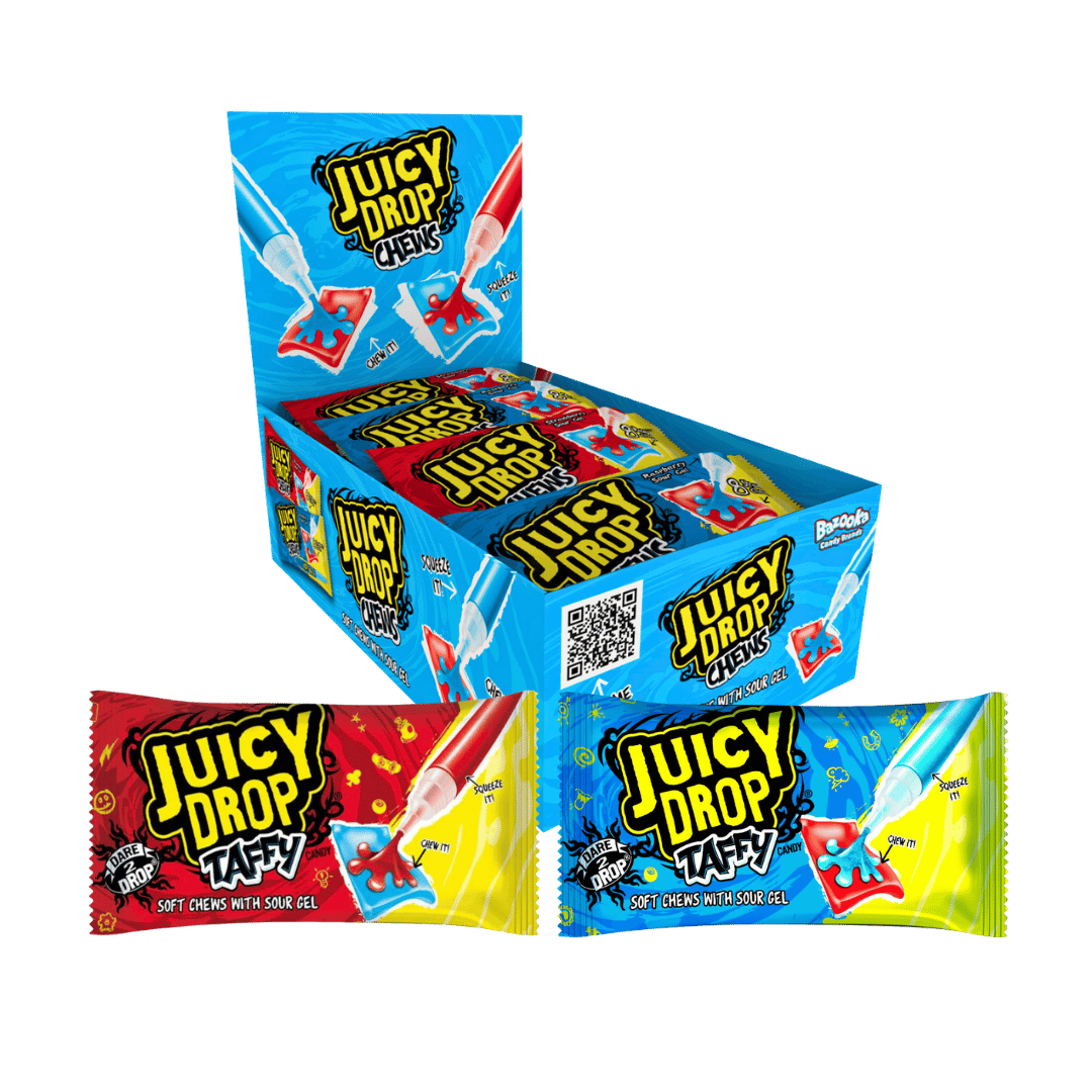 Bazooka Juicy Drop Chews bring you a unique candy experience. Squirt the super sour gel onto your raspberry or strawberry flavoured chewy sweets and create your perfect balance of sweet and sour. It’s a DIY sweet treat that’s as fun to make as it is to eat – an absolute must-try for adventurous snackers.