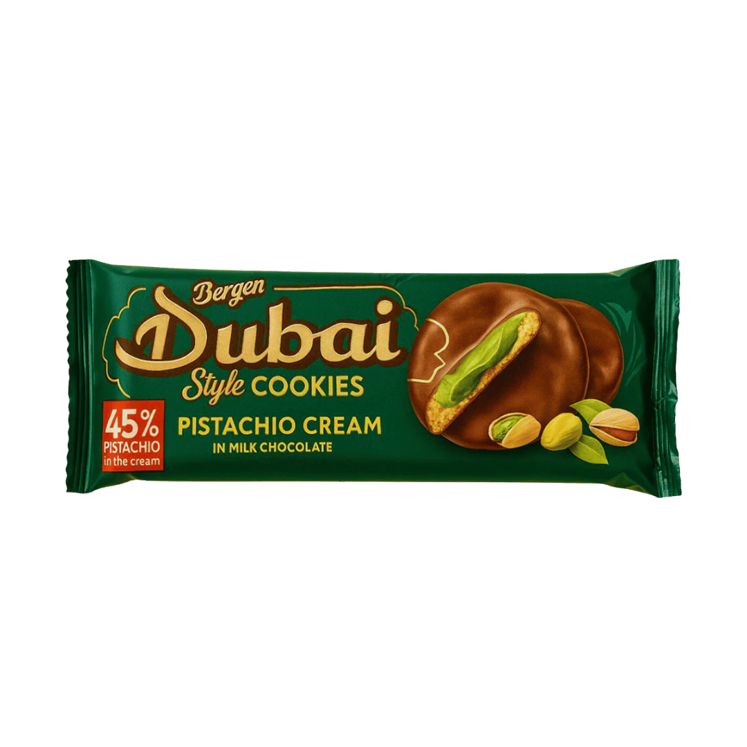 Crisp, chocolatey and irresistibly nutty – Bergen Dubai Style Cookies deliver a bold crunch with every bite. Each cookie is filled with rich pistachio cream (45%) and wrapped in smooth milk chocolate for the perfect sweet indulgence.