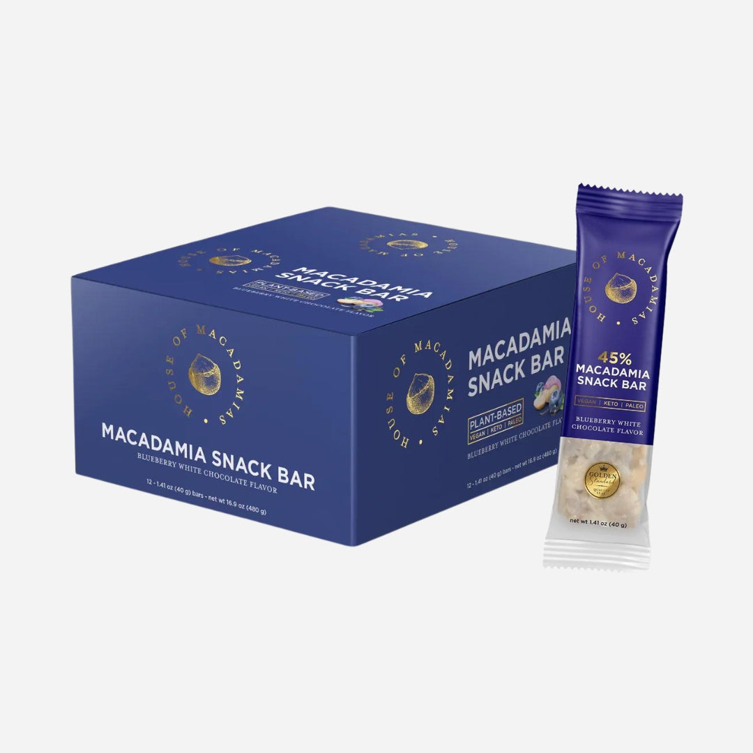 Indulge in the sweet nostalgia of blueberry muffin flavour – reimagined in a vegan, keto, and paleo-friendly snack bar. Made with 45% premium dry-roasted macadamias, dried blueberries and a crisp coating of dairy-free berry white chocolate, these bars offer a satisfying crunch with every wholesome bite.