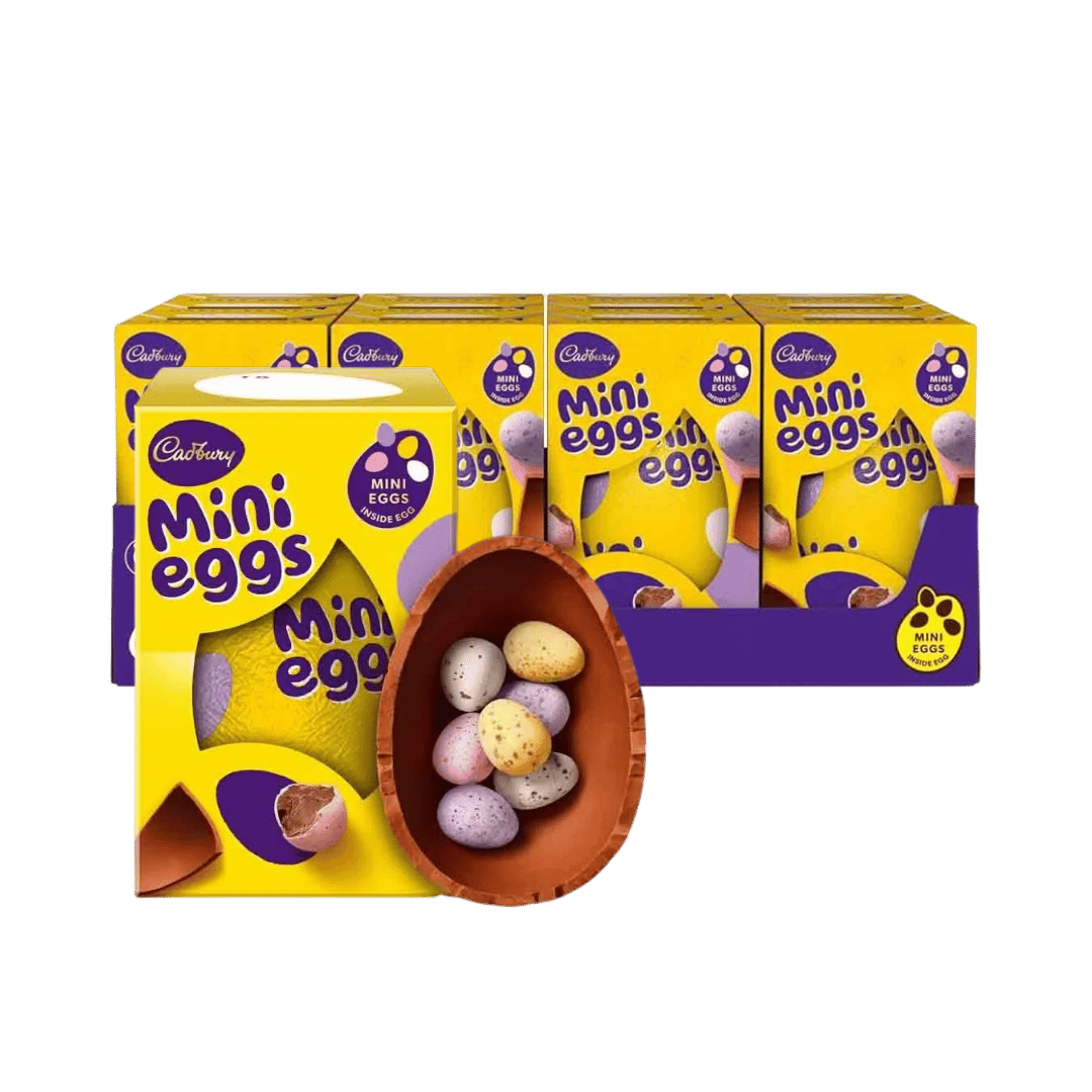 Enjoy a deliciously thick Cadbury Dairy Milk chocolate egg, made with the classic, creamy taste you know and love. Hidden inside, you’ll find a double helping of Cadbury Mini Eggs – crisp sugar shells with smooth milk chocolate centres.
