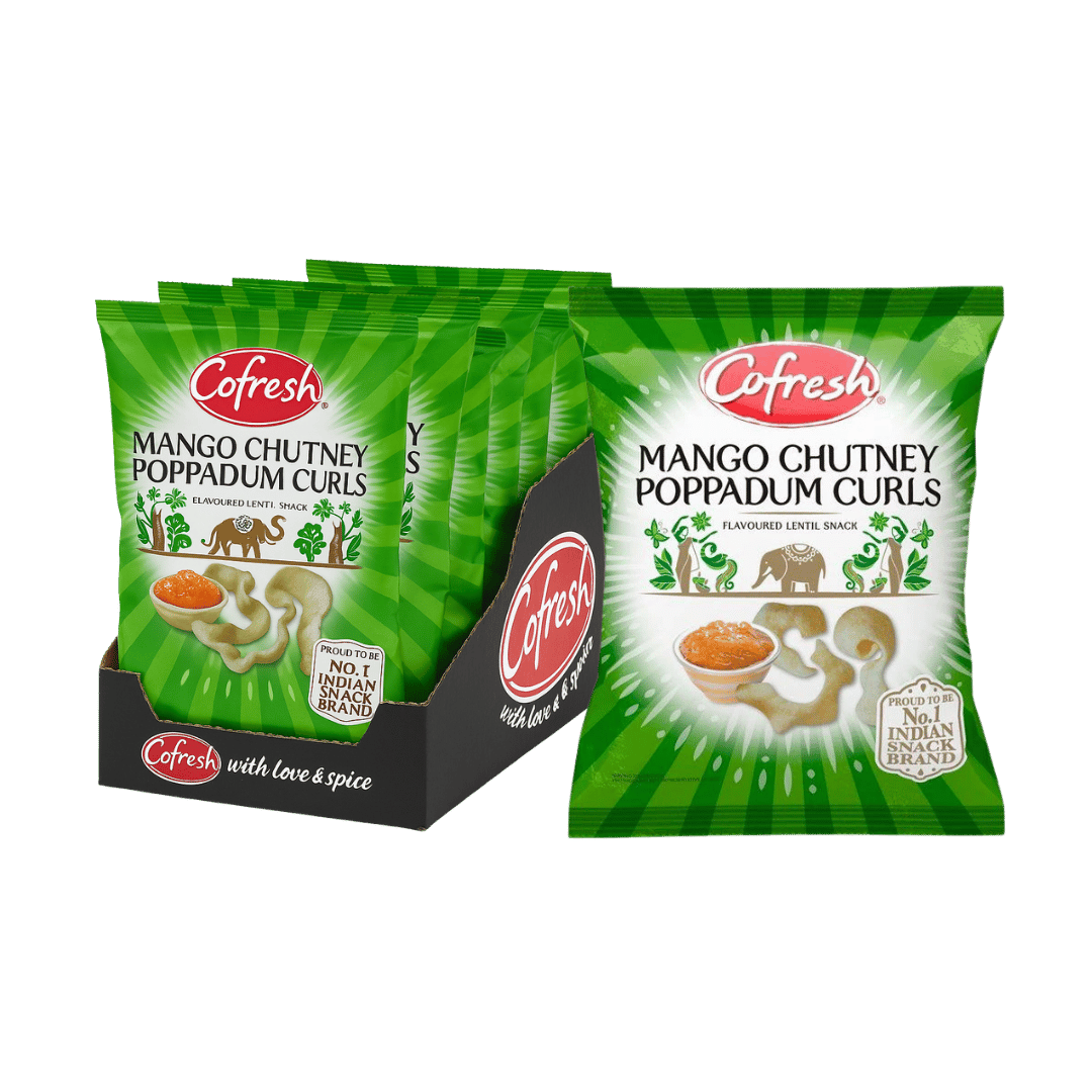 Delight in the exotic flavours of Cofresh Mango Chutney Poppadum Curls – a sweet and tangy lentil snack made from the finest quality ingredients. These crunchy, uniquely curled poppadums are infused with the fruity sweetness of mango chutney for a perfect balance of texture and flavour.
