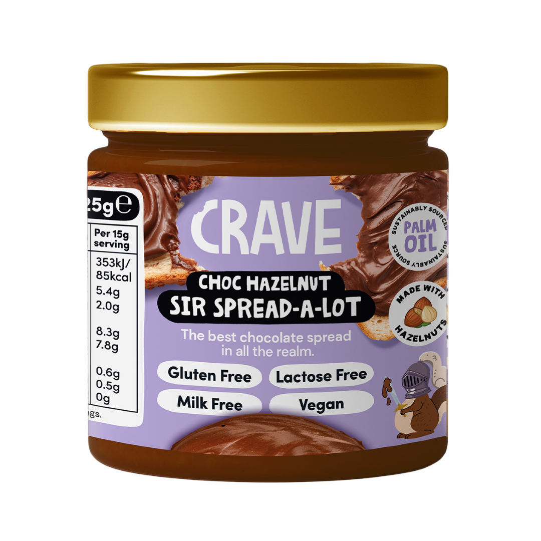 Crave’s Choc Hazelnut Sir Spread-A-Lot is a royally indulgent vegan chocolate spread, crafted for those who dare to dream of creamy, nutty goodness without compromise. Made with real hazelnuts and rich cocoa, it’s gluten free, milk free, lactose free – and packed with flavour fit for a king or queen.