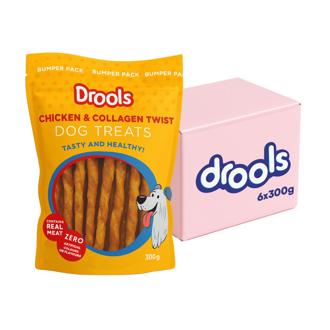Support your dog’s daily health and chewing instinct with Drools Chicken and Collagen Twists – tasty, protein-packed treats made with real chicken and natural collagen to help maintain joint and skin health.