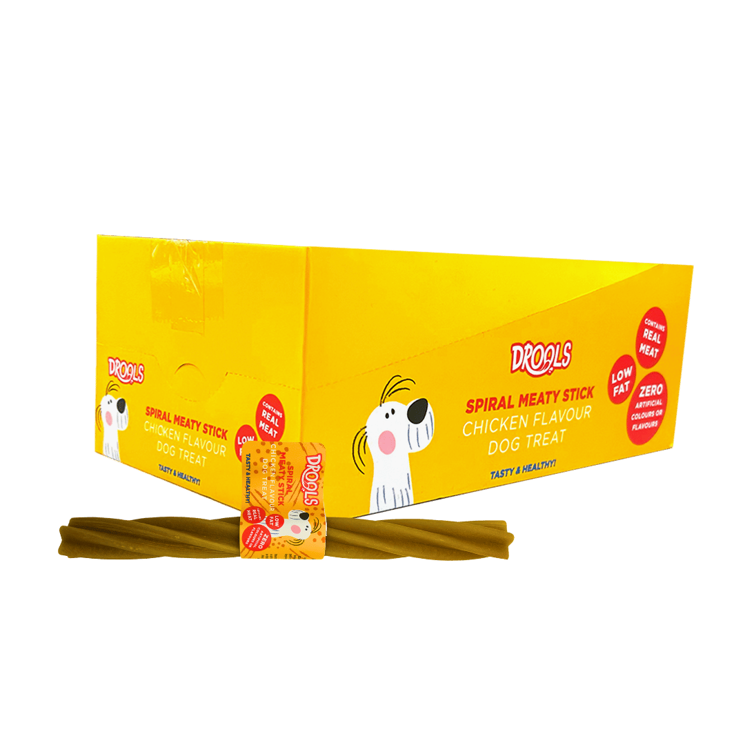 Delight your dog with the chewy satisfaction of Drools Spiral Meaty Sticks, made with real chicken and packed with tail-wagging flavour. These spiral-shaped treats are not only fun to chew but also low in fat, making them perfect for everyday rewarding.