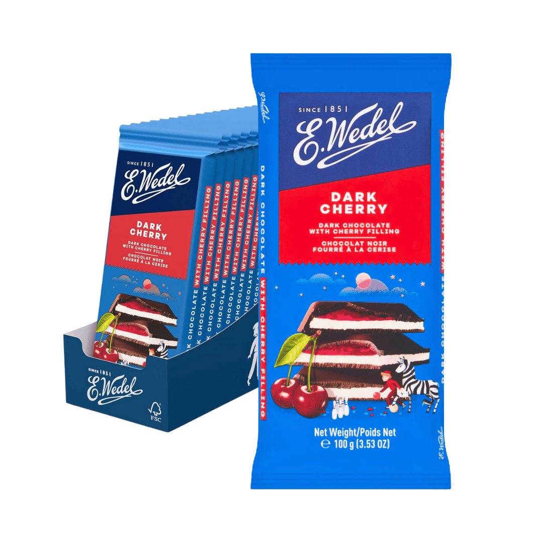 Indulge in a bold twist on tradition with E. Wedel Dark Chocolate with Cherry Filling – where expressive, velvety dark chocolate meets a luscious milk filling and bursts of juicy cherry.