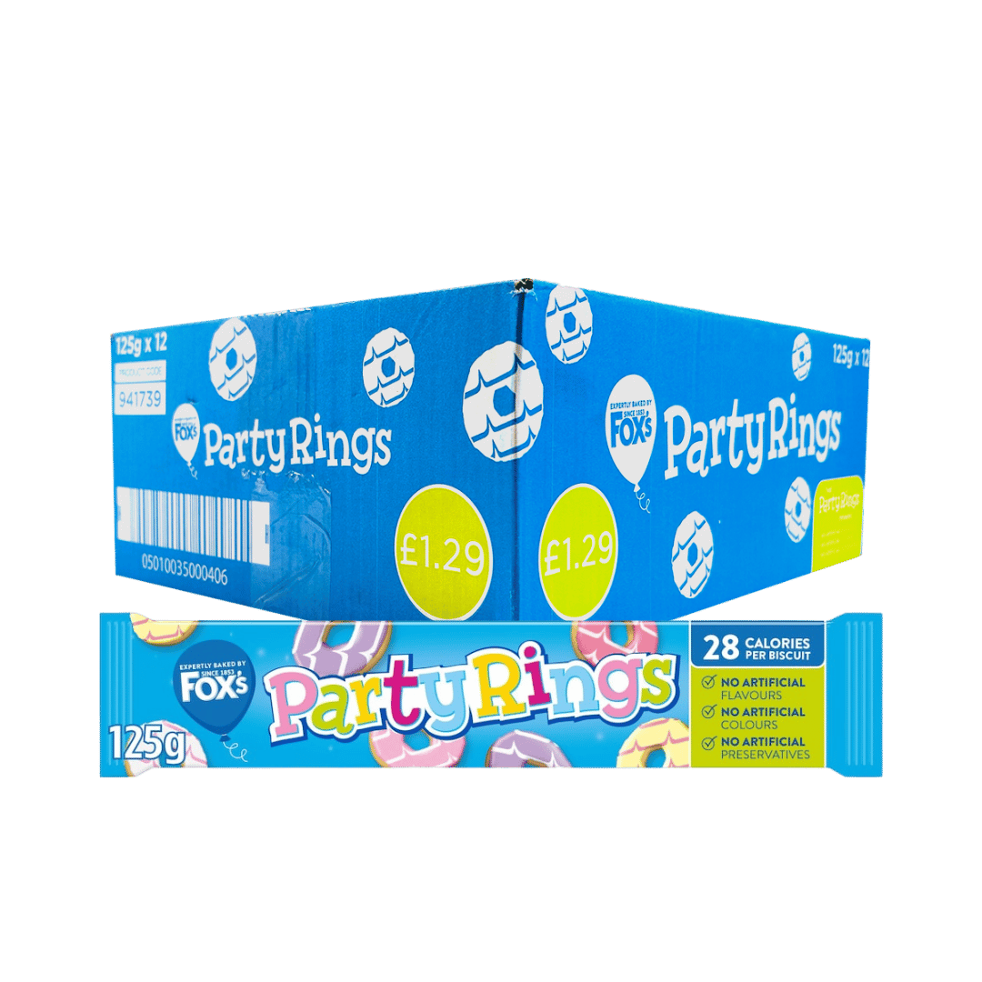 Make every day a party with the iconic Fox’s Party Rings – the colourful, crunchy iced biscuits that bring joy to snack time. These much-loved ring-shaped treats are topped with crisp, pastel-coloured icing, making them perfect for birthdays, lunchboxes, and everyday moments of celebration.