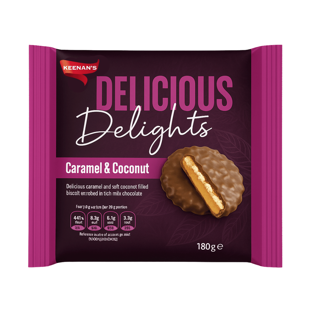 Treat yourself to a truly delightful bite with Keenan's Caramel & Coconut Classic Biscuits – a luscious fusion of smooth caramel and sweet coconut, nestled in a crisp, golden biscuit.