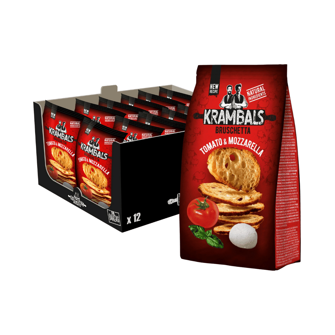 Krambals Bruschetta Tomato & Mozzarella are artisan-crafted bites made with fresh, natural ingredients. Slow fermented with natural yeast for a rich, rustic taste, these gourmet snacks combine the classic Mediterranean flavours of sun-ripened tomatoes and creamy mozzarella.