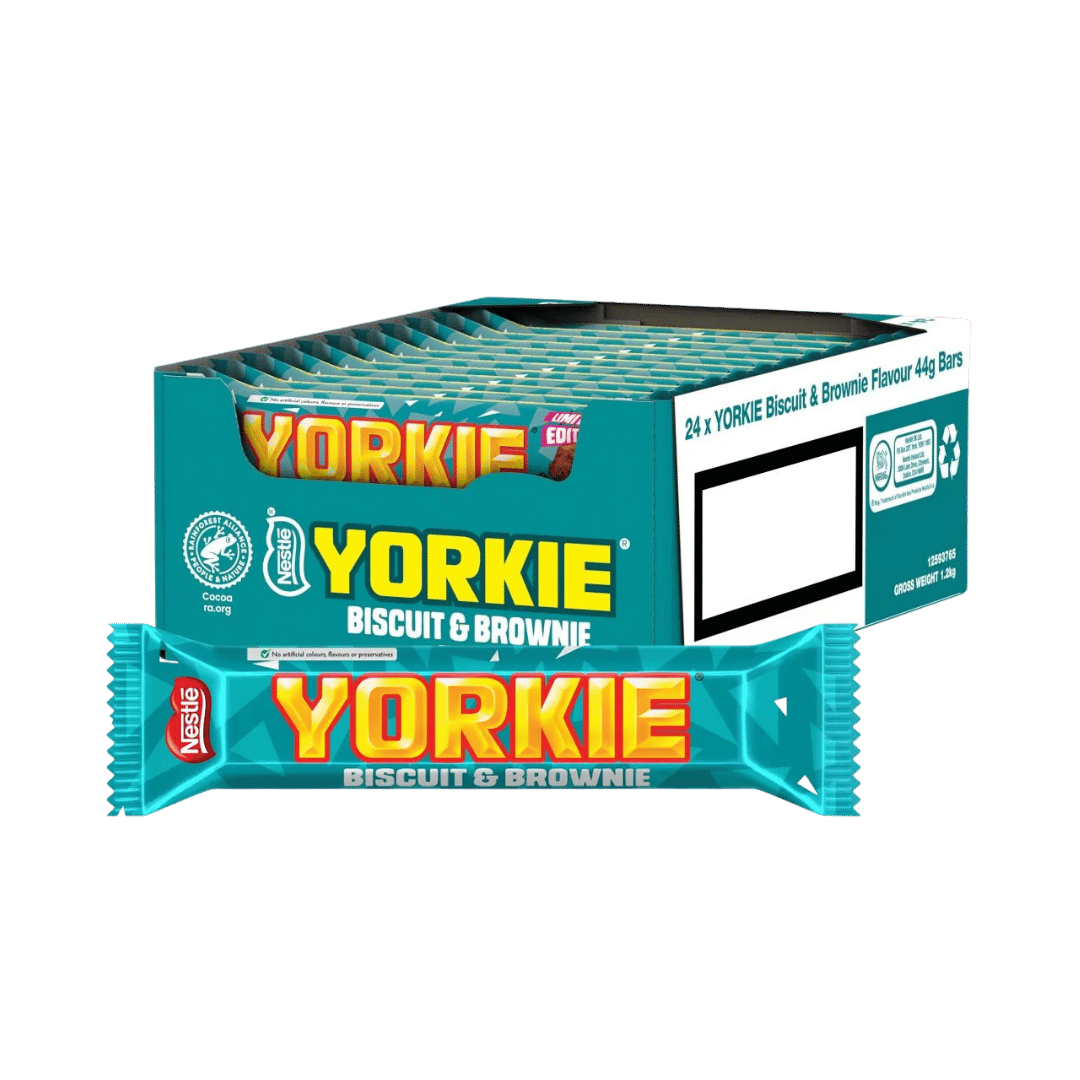 The limited-edition Yorkie® Biscuit & Brownie bar puts a delicious twist on the original. Packed with solid chunks of brownie-flavoured milk chocolate and crunchy biscuit pieces, it delivers the same satisfying heft and no-nonsense chocolate punch Yorkie® is famous for.