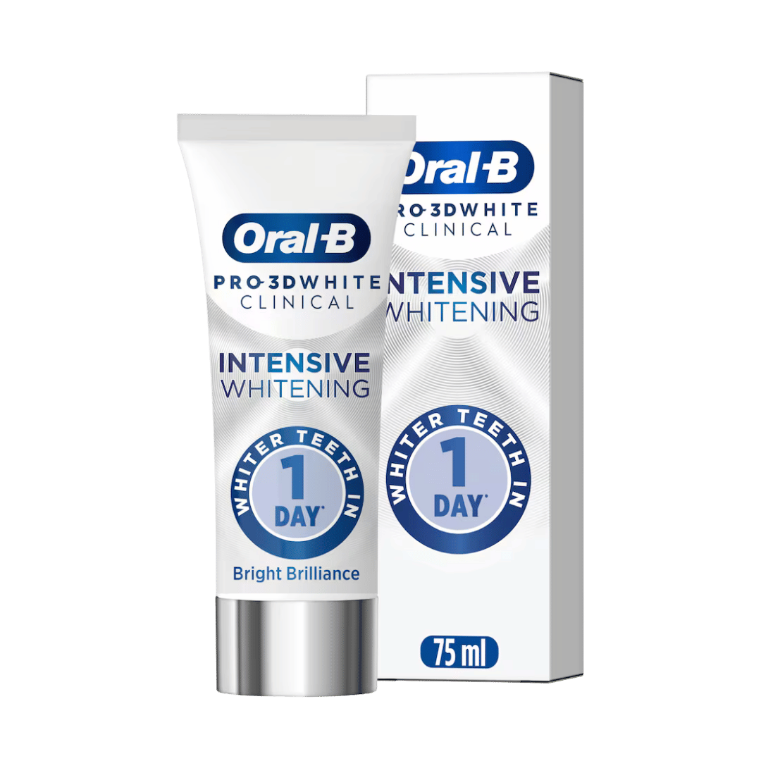 Transform your smile with Oral-B Pro 3D White Clinical Intensive Whitening Toothpaste – the most advanced whitening formula from Oral-B. Clinically proven to whiten teeth in just one day by removing surface stains, this premium toothpaste uses unique Ionic Technology to lift stains gently without scrubbing.