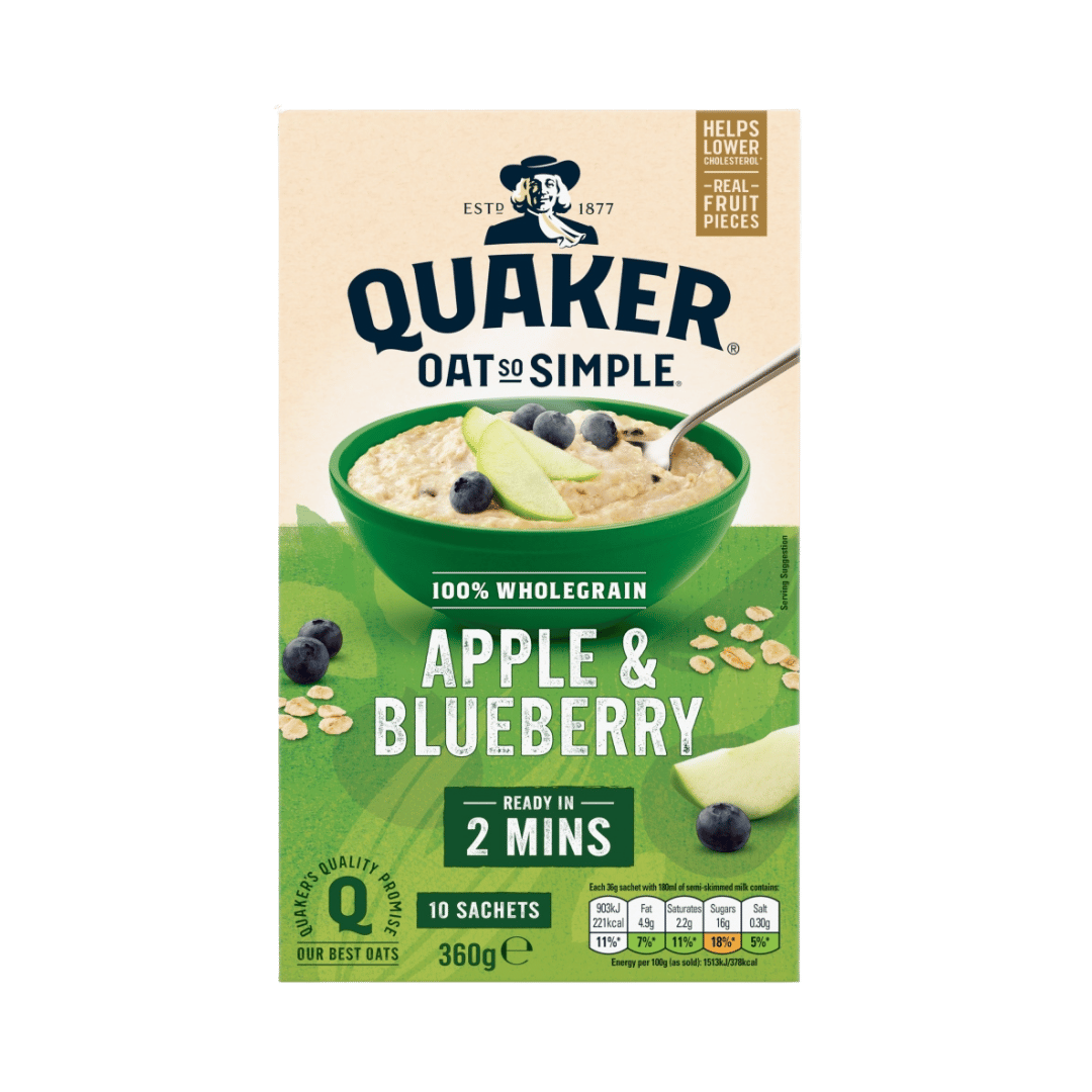 Brighten your morning with Quaker Oat So Simple Apple & Blueberry Porridge. Made with 100% British wholegrain oats and real fruit pieces, this delicious combination of sharp apple and sweet blueberry delivers a fruity, comforting start to your day.