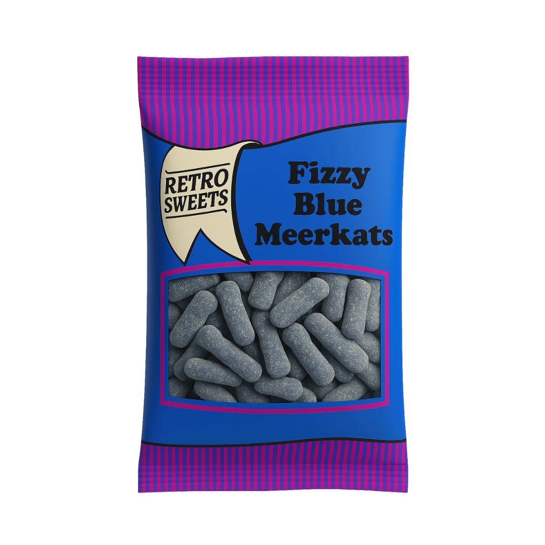 Retro Sweets Fizzy Blue Meerkats are fruit-flavoured jelly sweets shaped like tall meerkats and coated in a tangy fizzy sugar. With their bright blue colour and zingy taste, these trendy sweets are a must-have for pick & mix fans – and they’re suitable for vegans too!