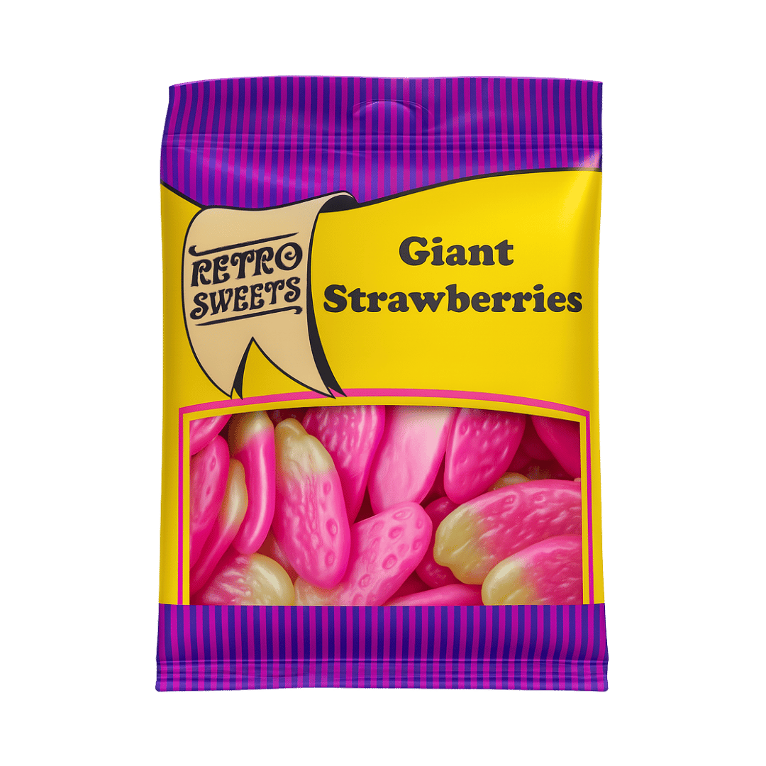 Retro Sweets Giant Strawberries are soft, chewy gummy sweets shaped like large, flat strawberries. Packed with sweet, fruity flavour, they’re a nostalgic pick and a popular choice for sweet lovers everywhere – just like the iconic Haribo Giant Strawbs!