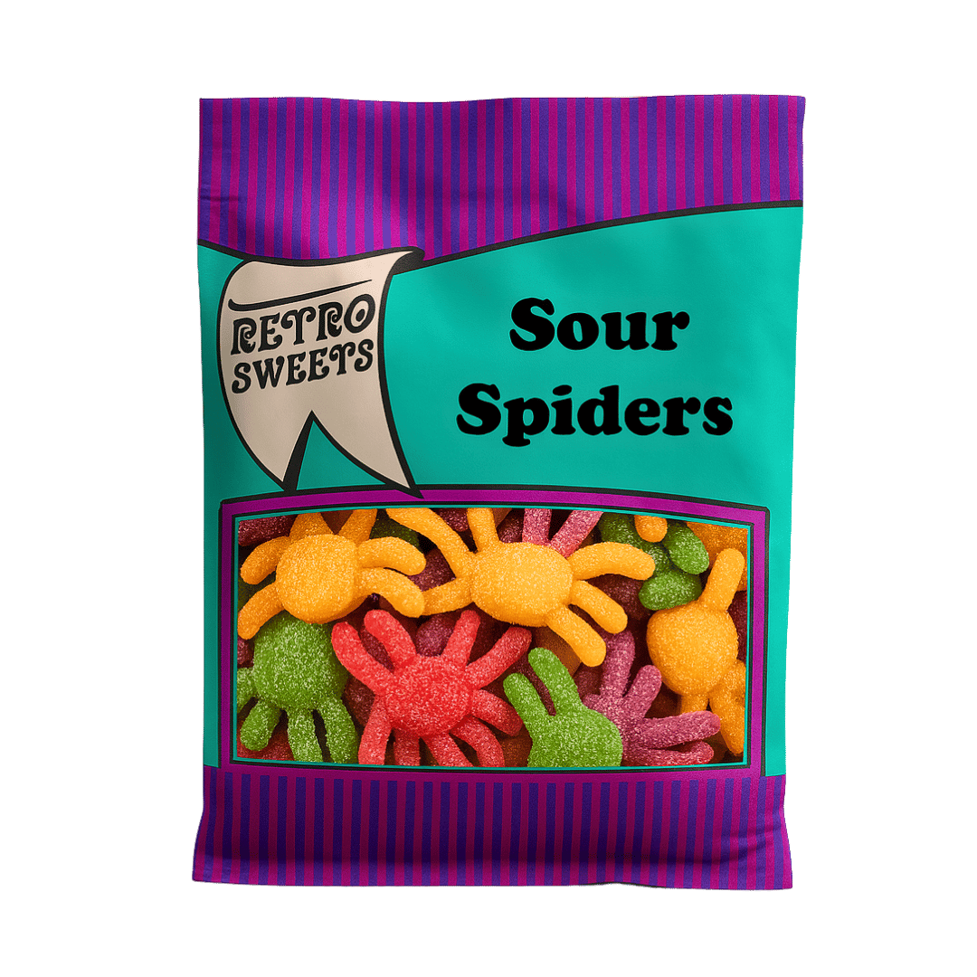 Retro Sweets Sour Spiders are brightly coloured jelly sweets shaped like spiders, packed with a real sour kick! Fun, fruity, and full of zing, these creepy-crawly treats are perfect for sour sweet fans and pick & mix collections.