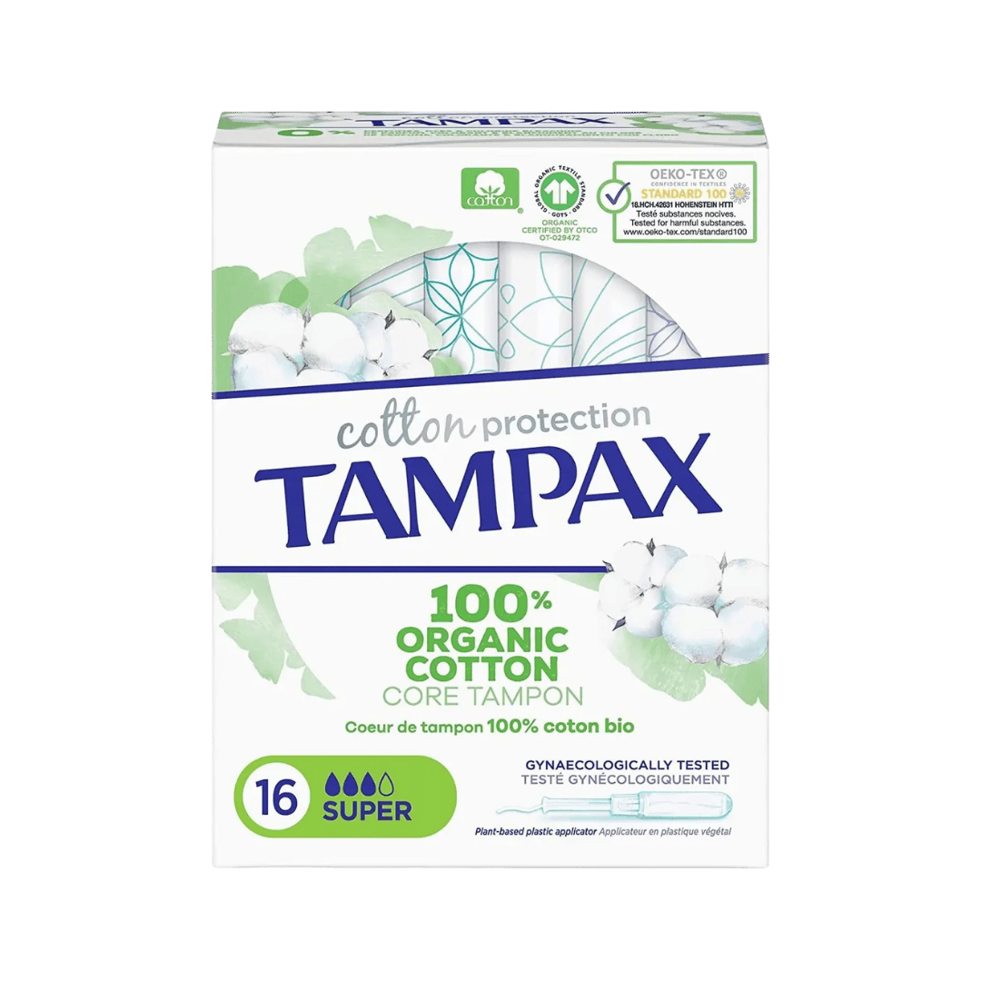 Tampax Cotton Protect Super tampons feature a 100% organic cotton core for Tampax’s best comfort and protection. Free from fragrances, dyes, and chlorine bleaching, these tampons are designed for medium to heavy flow days with MotionFit technology that gently expands to fit your body’s unique shape.