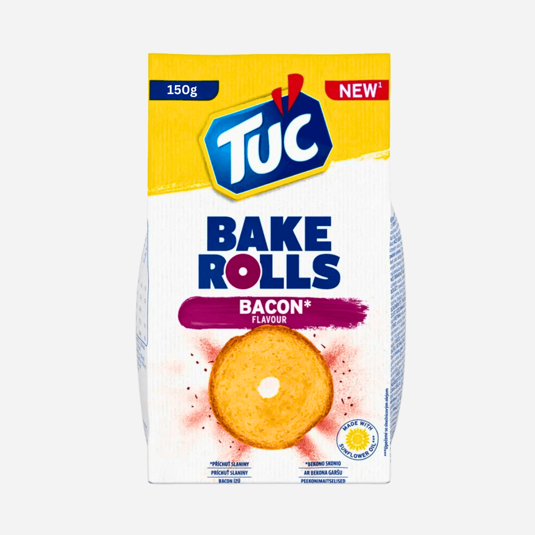 Crunch into the bold, smoky flavour of Tuc Bake Rolls Bacon – oven-baked to perfection and bursting with rich, savoury bacon taste. These golden, crispy rounds are the ultimate snack for bacon lovers and make a deliciously moreish partner for dips, cheese boards, or munching straight from the bag.