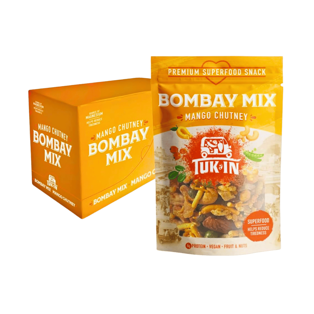 Tuk In’s Mango Chutney Bombay Mix is a sunshine-filled snack with the soul of an Indian spice bazaar. Juicy mango sweetness meets fragrant spices and a superfood crunch, creating an unforgettable flavour fusion. Crafted for taste and nutrition, each bite delivers bold personality, plant-based power and a deliciously exotic twist.